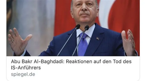 Alman dergisi Der Spiegel yeni bir skandala imza attı. Dergi DEAŞ lideri Bağdadi'nin öldürüldüğü haberini Cumhurbaşkanı Erdoğan'ın fotoğrafıyla duyurdu. Dergi haberin başlığında “Tepkiler: Dünya Al-Baghdadi'yi özlemeyecek" ifadelerini kullandı. Dergi daha önce de Erdoğan hakkında küstah ifadelere yer vermişti.