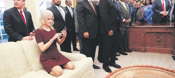 Trump’ın danışmanı Kellyanne Conway dünyayı dize getirdi! Beyaz Saray’daki Oval Ofis’in kanepesine yayılıp başkanın toplantısını seyretti!