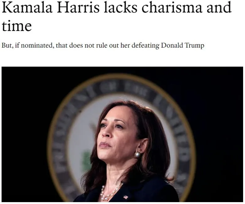 Kamala Harris için "Karizması ve zamanı yok" diyen The Economist, Harris'in Barack Obama ve Donald Trump gibi kendi karizmaları ve cüretkarlıkları ile değil, George Bush ve Joe Biden gibi aile isimleri, Kongre'de görev yapmış olmak ve güçlü büyüklerin akıl hocalığından yararlanarak yükseldiğini belirtti.
