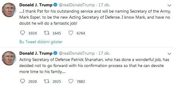 ABD Başkanı Trump, Shanahan'ın bakan adaylığıyla ilgili olarak Twitter'dan açıklama yaptı.