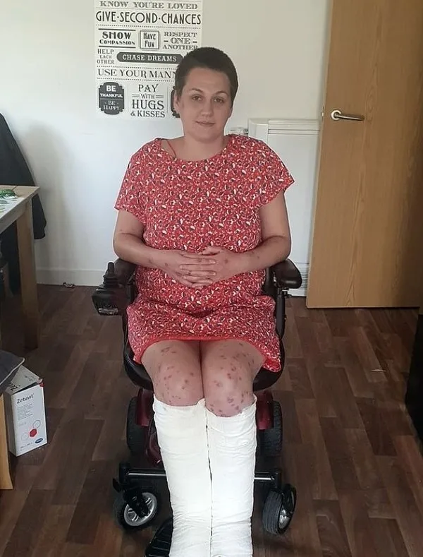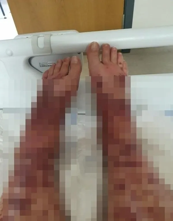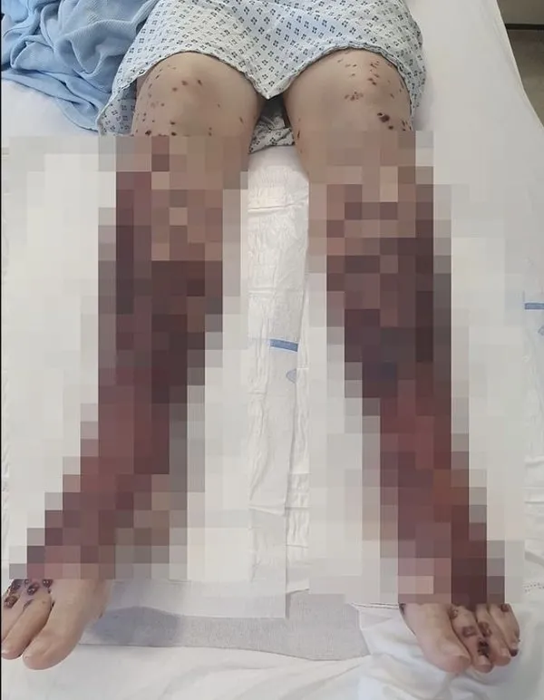 Ayak bileklerinin etrafında kızarıklıklar oluştuğunu gören kadın, kontrol için hastaneden randevu aldı. Ancak birkaç saat sonra ayak bileklerinin çevresinde içi su ve kanla dolu kabarcıklar oluştu. Bir gün içinde tüm bacaklarını kaplayan kabarcıklar, vücudunun birçok yerine de sıçradı.