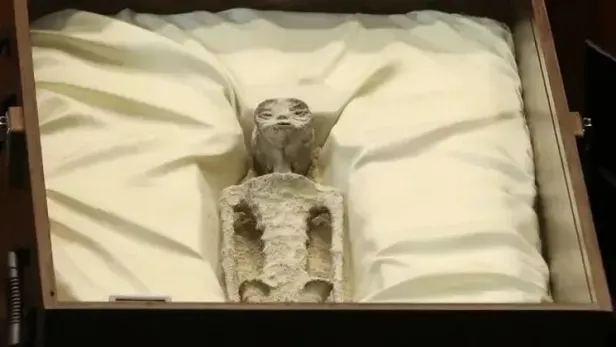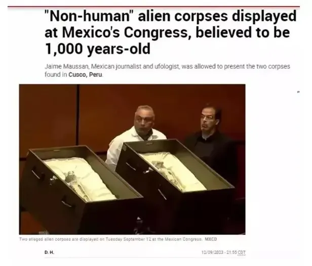 Meksika Kongresi'nde yapılan bir özel oturumda 'uzaylı' olduğu iddia edilen iki kalıntı sergilendi. Kendini UFOlog olarak tanımlayan Jaime Maussan tarafından cam muhafazalar içinde sunulan fosilleşmiş cesetlerin bin yıllık olduğu belirtildi.