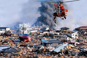 Karayolları yıkılan ve sular altında kalan Sendai bölgesinde, depremzedeler helikopterlerle kurtarılıyor.