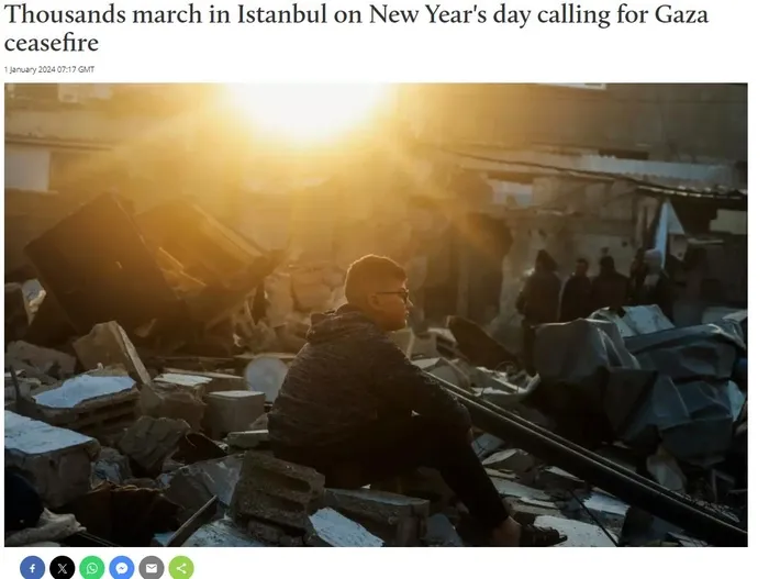 İngiltere merkezli Middle East Eye, "Binlerce kişi yılbaşında İstanbul'da Gazze'de ateşkes çağrısıyla yürüdü" başlığını kullandı.