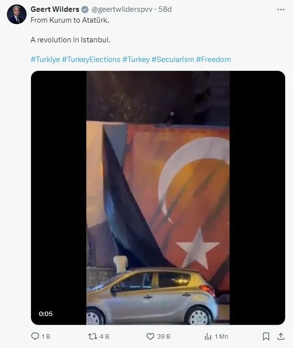 Terör devleti İsrail'in ardından bir hamle de Türkiye düşmanlığı ile bilinen Hollandalı siyasetçi Geert Wilders'dan geldi. Wilders, X hesabından yaptığı paylaşımda Başkan Erdoğan'ı hedef ald. AK Parti İstanbul Büyükşehir Belediye Başkanı Adayı Murat Kurum'un seçim afişlerinin indirildiği bir videoyu paylaşan Wilders, "Kurum'dan Atatürk'e. İstanbul'da devrim!" ifadelerini kullandı.