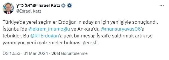 İsrail Dışişleri Bakanı İsrael Katz, yerel seçim sonuçları açıklanırken CHP'nin adayları Ekrem İmamoğlu ve Mansur Yavaş'ı tebrik etti.