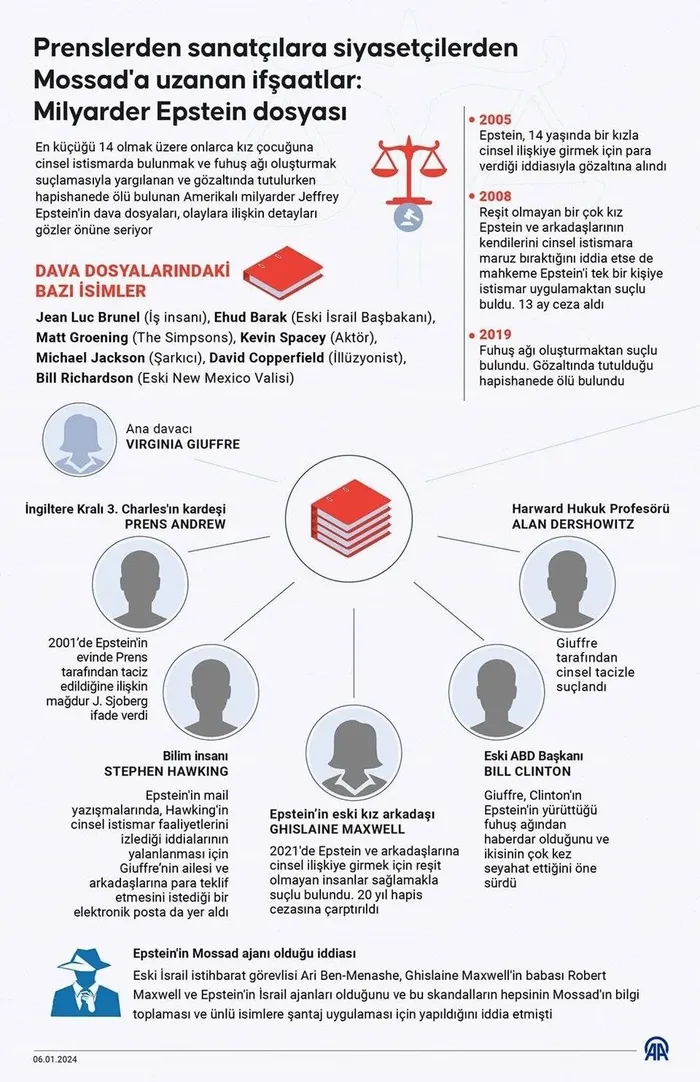 Açığa çıkan dosyalar, Epstein'in fuhuş ağına, Ghislaine Maxwell, Uluslararası Adalet Divanında (UAD) İsrail'i savunması planlanan avukat Alan Dershowitz, modellik ajansı sahibi Jean Luc Brunel, Prens Andrew, bilim insanı Stephen Hawking ve birçok ünlü ismin ortak olduğunu gösteriyor.