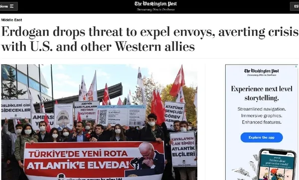 10 büyükelçinin skandal Kavala bildirisinin arkasında ABD Başkanı Biden'ın olduğu iddia edilmişti. İddiayı kanıtlar bir haber de ABD'li Washington Post'tan geldi. Gazete, "Erdoğan büyükelçilere tehdidini bıraktı ve ABD ve diğer Batılı müttefikleriyle krizi önledi" başlığını attı.