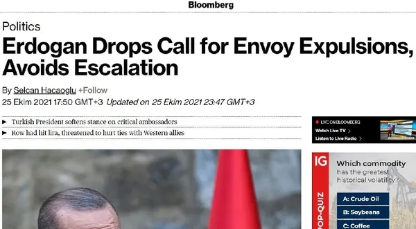 10 büyükelçinin geri adımını hazmedemeyen bir diğer gazete ise ABD merkezli medya kuruluşu Bloomberg, "Erdoğan büyükelçilerin sınır dışı edilmesi çağrısını iptal etti, gerilimden kaçtı" başlığını kullandı. Bloomberg, "Erdoğan büyükelçilerin sınır dışı edilme talebini bıraktı ve Türk lirasını sarsan diplomatik gerilimi azalttı. Bu gerilim Ankara'nın kilit partnerleriyle ilişkisini yıkıma uğratacaktı" ifadelerini kullandı.