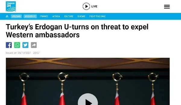 Türk düşmanlığı ile gündemden düşmeyen ve Yunanlıların yanında yer alan Macron'un ülkesi de geri adım ile çılgına dönen ülkelerden biri. France24, "Türkiye Cumhurbaşkanı Erdoğan, Batılı diplomatları sınır dışı etme tehdidinde U-dönüşü yaptı" başlığını kullanırken, "Büyükelçiliklerin Viyana Sözleşmesi açıklamalarından sonra Erdoğan, sınır dışı etme tehdidini geri çekti" dedi.
