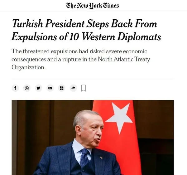 Başkan Erdoğan'ın 10 büyükelçiye had bildirmesinden rahatsız olan bir diğer gazete ise NYT oldu. Carlotta Gall imzalı skandal haberde, "Türkiye Cumhurbaşkanı 10 Batılı diplomatı sınır dışı etme kararından vazgeçti" başlığı kullanıldı.