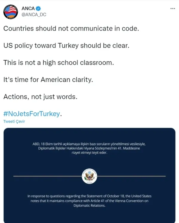 "Ülkeler kodlu iletişim kurmamalıdır. ABD'nin Türkiye'ye yönelik politikası net olmalıdır. Burası bir lise sınıfı değil. Amerikan netliğinin zamanı geldi. Eylemler, sadece kelimeler değil. Türkiye'ye jet yok."