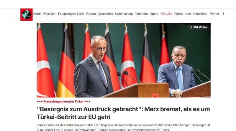 Alman Focus dergisi, Erdoğan–Merz görüşmesini Avrupa Birliği üyeliği ve Gazze tartışması çerçevesinde aktardı. Haberde, Merz'in Türkiye'nin AB sürecine temkinli yaklaştığı, Erdoğan'ın ise Gazze konusunda sert ifadeler kullandığı vurgulandı.