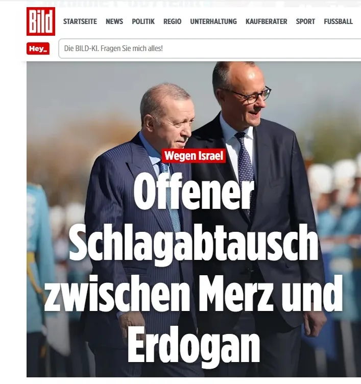 Erdoğan–Merz görüşmesi, Alman basınının önde gelen gazetesi Bild'in manşetine taşındı. Gazete, Ankara'daki ortak basın toplantısını "canlı kameralar önünde hararetli bir tartışma" olarak niteledi. Haberde, Erdoğan'ın konuşmasında "Gazze'de soykırım" ifadesini kullanmasının Merz'i rahatsız ettiği, bir Türk gazetecinin "Almanya tarihin yanlış tarafında mı?" sorusuyla ortamın gerildiği aktarıldı.