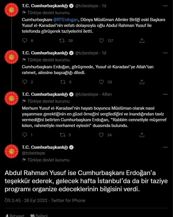 Cumhurbaşkanlığı İletişim Başkanlığından yapılan açıklamaya göre, Erdoğan, Abdul Rahman Yusuf ile gerçekleştirdiği telefon görüşmesinde, Yusuf el-Karadavi'ye Allah'tan rahmet, ailesine başsağlığı diledi.