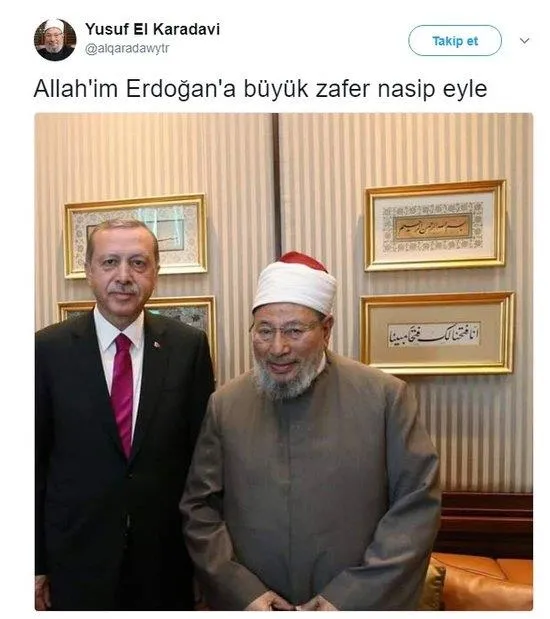 Müslüman Alimler Birliği Başkanı Yusuf el-Karadavi, Türkiye'deki gelen darbe girişiminin başarısız olmasından dolayı Başkan Recep Tayyip Erdoğan'ı kutlamıştı.