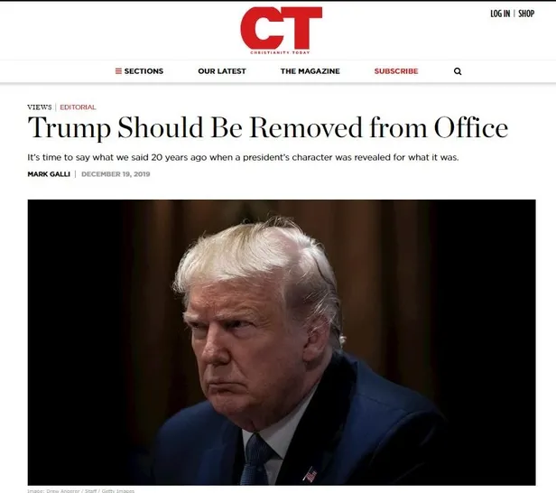 Evanjelistlerin dergisi olarak bilinen Christianity Today, ABD Başkanı Trump'ın 'görevden alınması için' çağrı yaptı. Derginin baş editörü Mark Galli, yazıda "Trump'ın Twitter anasayfası bile ahlaki olarak kaybolmuş ve kafası karışmış bir kişinin mükemmel örneğidir" ifadelerini kullandı. Dergi, Bill Clinton’ın azledilmesinin ardından da benzer bir yazı yayımlamıştı.