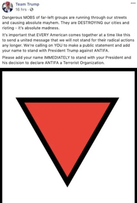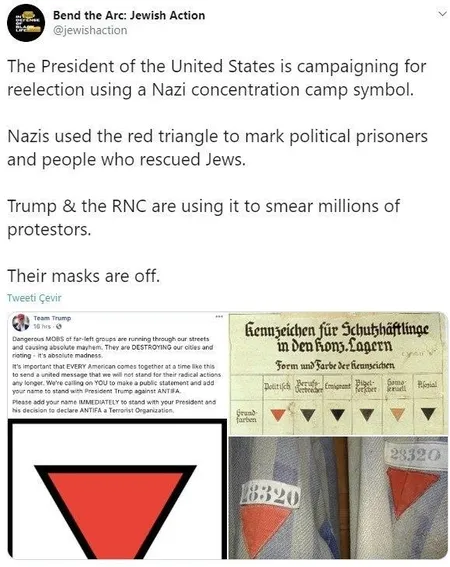 Trump'ın kampanya yetkilileri ise paylaşımlarda kullanılan kırmızı ters üçgen sembolünün Nazi kamplarındaki siyasi mahkumların aksine aşırı sol örgüt olarak bilinen Antifa'yı temsil ettiğini öne sürdü.
