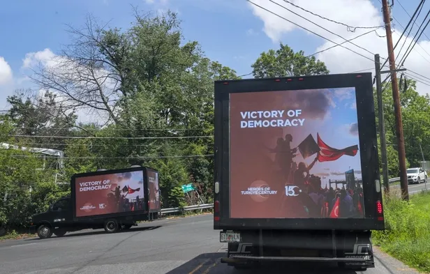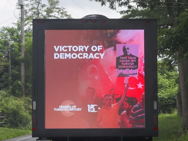 Diğer taraftan ışıklı tabelalarda, Türk bayrağı ve darbe girişimi gecesinden fotoğraflarla birlikte, "Demokrasinin Zaferi" yazan iki araç, FETÖ elebaşının bulunduğu Saylorsburg sokaklarında sabahtan yerel saatle 16.00'ya kadar tur attı.