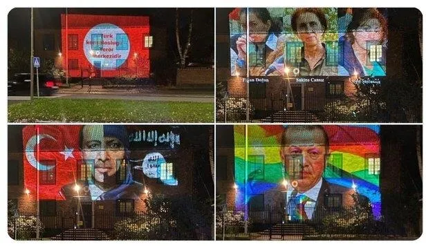 Stockholm'de PKK/YPG'liler, Türkiye'nin Stockholm Büyükelçiliği'nin duvarlarına terör örgütü propagandası ve Başkan Erdoğan'a yönelik hakaret içeren görüntüler yansıttı.