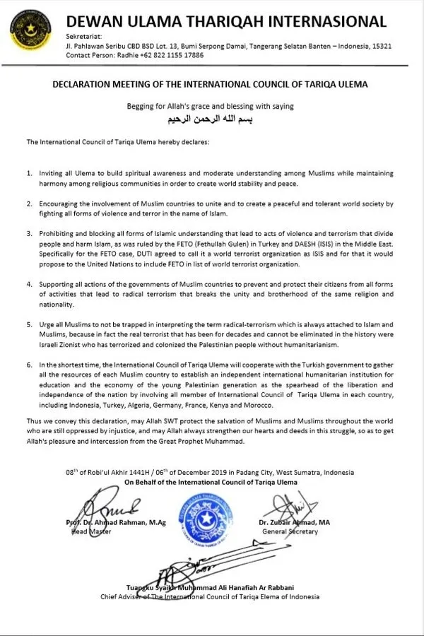 Uluslararası Sufi Ulema Meclisi (DUTİ), Endonezya'nın Batı Sumatra eyaletindeki Padang kentinde, dünya barışı ve istikrarının sağlanması, şiddet ve terör olayları ile mücadele, terör örgütleri FETÖ ve DEAŞ hakkında düzenlediği toplantıya ilişkin bildiri yayınladı.