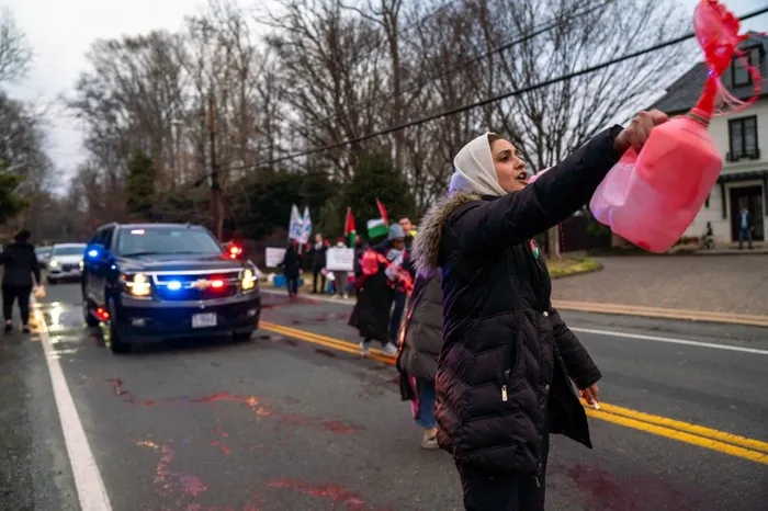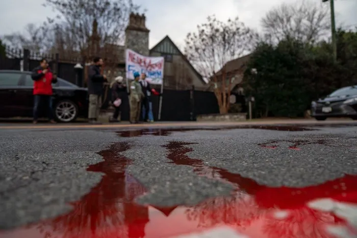 Protestocular, Blinken'ın evinin önüne döktükleri kırmızı boyalarla da kan görüntüsü oluşturdu.