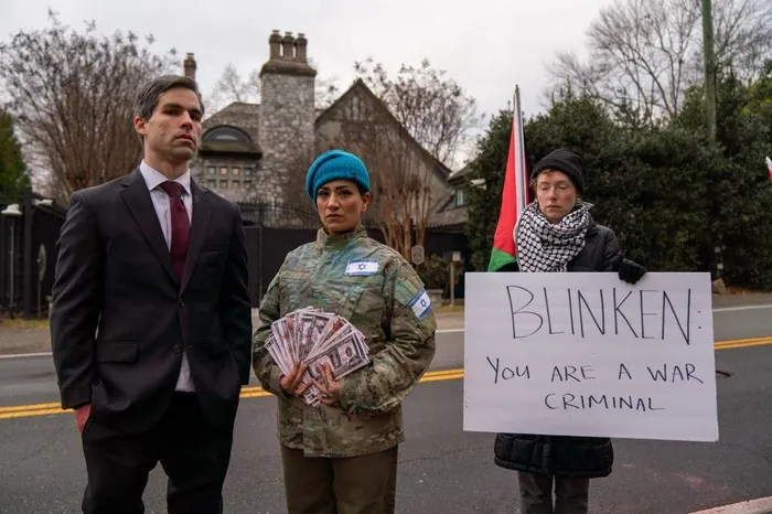 Göstericiler ayrıca, Blinken'ın, Virginia eyaletinin McLean semtindeki konutunun karşısına kendisine benzeyen, elleri kana bulanmış bir mumya bıraktı.