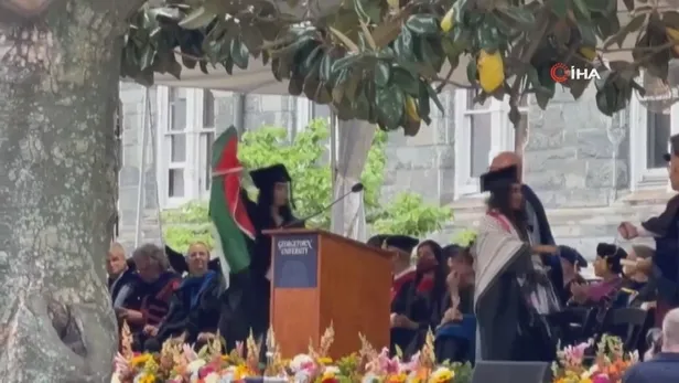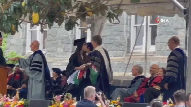Elindeki Filistin bayrağını sallayarak diplomasını almak üzere sahneye çıkan Filistinli bir öğrenci, sahnede bulunan ve öğrencileri tebrik eden ABD Dışişleri Bakanı Antony Blinken'ın elini sıkmadı.