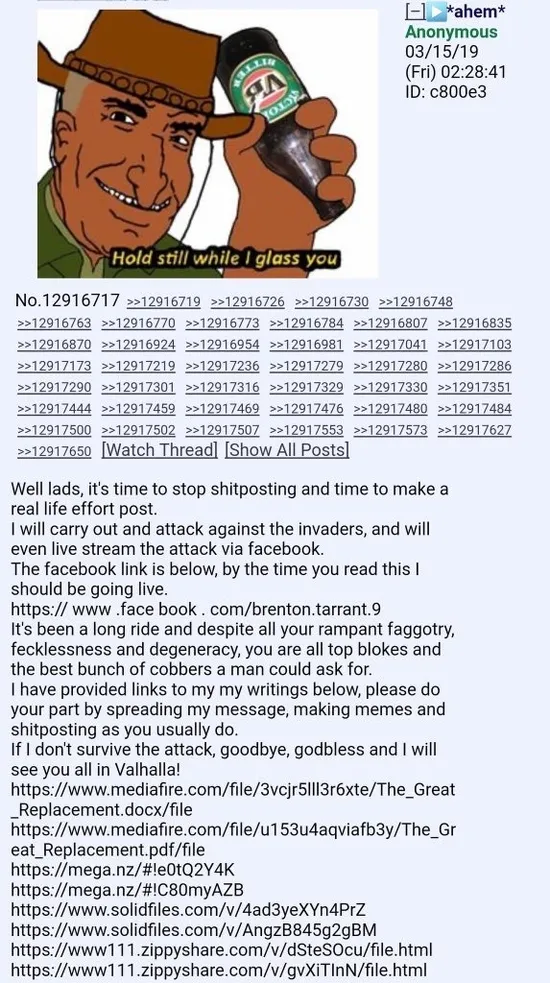28 yaşındaki Brenton Tarrant, Perşembe akşam saat 20.28'te 8ch.net isimli foruma bu mesajı paylaştıktan 17 saat sonra Cuma namazı esnasında el Nur Camii'ne girerek soğukkanlı ve planlı bir şekilde onlarca Müslümanı şehit etti.