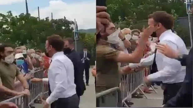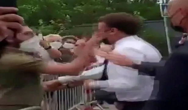 Cumhurbaşkanı'nın yaklaştığı kişi, bir eliyle kolunu tuttuğu Macron'a diğer eliyle tokat attı.