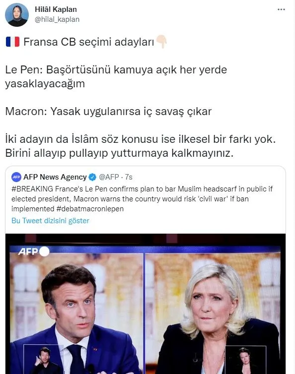 Fransa'da 24 Nisan pazar günü düzenlenecek cumhurbaşkanı seçiminin ikinci turundan önce adaylar Cumhurbaşkanı Emmanuel Macron ve aşırı sağcı Marine Le Pen canlı yayında karşı karşıya geldi. İslam karşıtlığı üzerinden kurdukları politika ile propaganda yapan iki lider yasaklar konusunda birbirine girdi. Başörtüsünün kamuya açık alanlarda yasaklanması halinde buna diğer dini sembollerin eklenmesi gerektiğine işaret eden Macron, Le Pen'in başörtüsü yasağı talebine dair "Bunu yaparsanız iç savaş çıkarırsınız. Söylediğin çok ciddi bir şey." dedi.