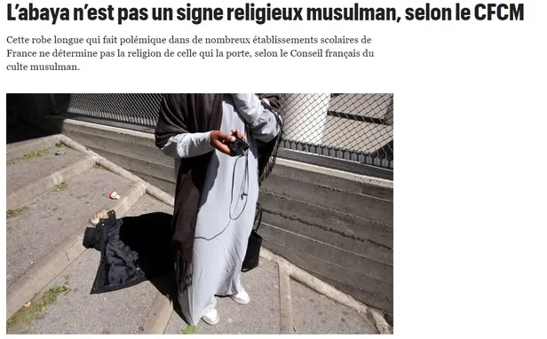 Le Parisien gazetesi, 7 Haziran'da sırtı dönük başörtülü genç kızın fotoğrafını "Laiklik. Okul abaya sorunuyla karşı karşıya" başlığıyla manşete taşıdı.