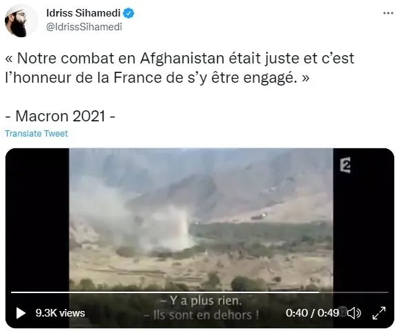 Macron'un pazartesi akşamı yaptığı "Afganistan'daki mücadelemiz adildi ve Fransa buna katılmaktan onur duydu." açıklamalarının ardından Twitter kullanıcıları, France 2 televizyonunda yayımlanan bir belgeselden alınan görüntüleri paylaştı.