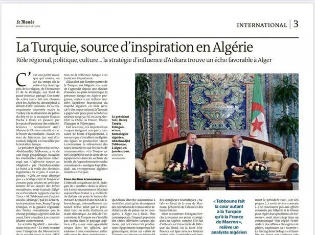 Fransız gazetesi Le Monde, Türkiye'nin Afrika üzerindeki etkinliğini gündeme aldığı dosya haberinde Cezayir'in ilham kaynağının Türkiye olduğunu yazdı. Ankara'nın bölgesel rolüne vurgu yapılan yazıda, Türkiye'nin gücü ve siyaset kültürü ile Cezayir'i etkilediği kaydedildi.