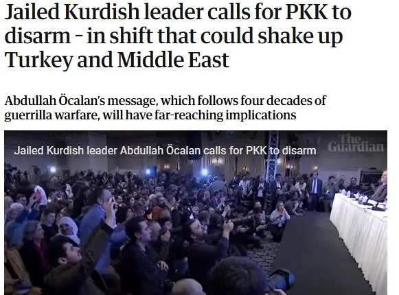 The Guardian ise Öcalan'ın mesajının Orta Doğu'yu sarsabilecek bir değişim olduğunu belirtti ve bölgede çok kapsamlı etkileri olabileceğine dikkat çekti.