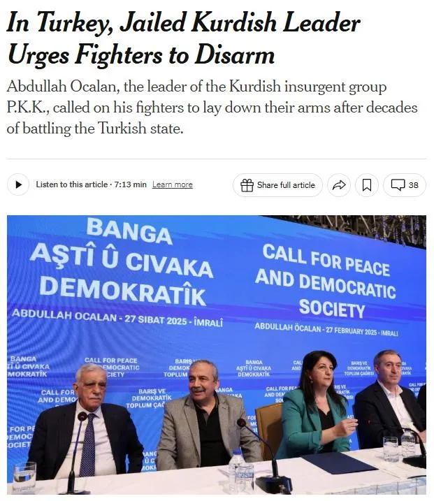 ABD gazetesi New York Times, Öcalan'ın yazdığı mektubun komşu ülkelerde de yankı bulabileceğine dikkat çekti. New York Times ayrıca "PKK'nın silah bırakması, Türkiye'nin en uzun süredir devam eden iç güvenlik tehdidinin çözülmesi anlamına gelecek ve Cumhurbaşkanı Recep Tayyip Erdoğan açısından önemli bir siyasi başarıya işaret edecektir." ifadelerini kullandı.