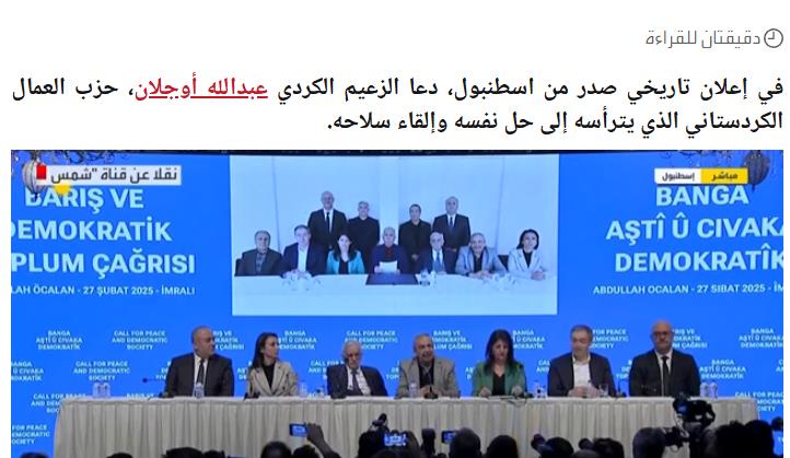 Suudi Arabistan haber ajansı Al Arabiya "Öcalan İstanbul'dan yaptığı tarihi açıklamada PKK'yı dağıtıp silah bırakmaya çağırdı" dedi.