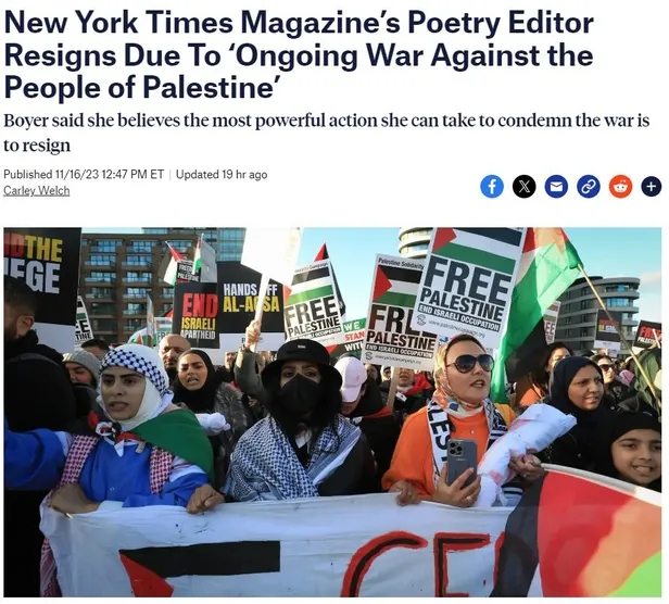 ABD'nin soykırımcı İsrail yanlısı politikası New York Times'ta ise büyük bir istifa ile sonuçlandı. New York Times'ın pazar ekinin Şiir Editörü Anne Boyer, gazetenin İsrail'in Gazze saldırılarına ilişkin haberlerine "Artık savaş çığırtkanı yalanlar yok" ifadeleriyle tepki gösterdi ve istifa etti.