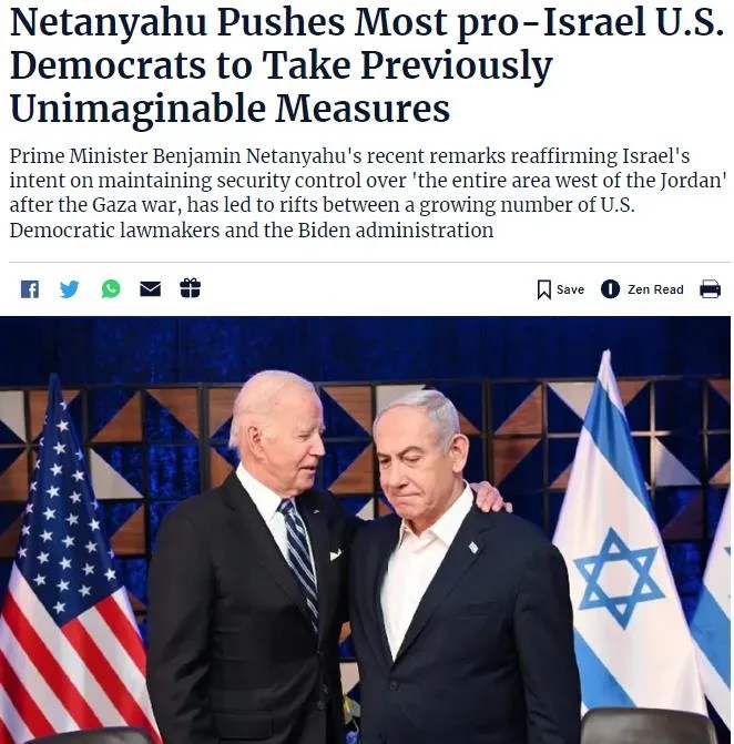 İsrail gazetesi Haaretz ise "Netanyahu İsrail yanlısı ABD'li Demokratların çoğunu daha önce hayal bile edilemeyecek önlemler almaya zorladı" başlıklı bir haber yayımlarken Netanyahu'nun "İsrail'in Gazze savaşından sonra 'Ürdün'ün batısındaki tüm bölge' üzerinde güvenlik kontrolünü sürdürme niyetini yeniden teyit eden son sözleri, giderek artan sayıda ABD'li Demokrat milletvekili ile Biden yönetimi arasında sürtüşmeye yol açtı." ifadelerini kullandı.