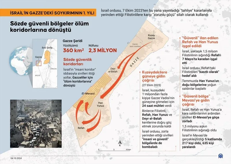 İsrail ordusu, 7 Ekim 2023'ten bu yana yayınladığı "tahliye" kararlarıyla yerinden ettiği Filistinlilere karşı "zorunlu göçü" silah olarak kullandı. İsrail, defalarca yeni bir harita paylaşarak ve havadan broşürler atarak Gazzelilerden bulundukları bölgeyi boşaltmalarını istedi.