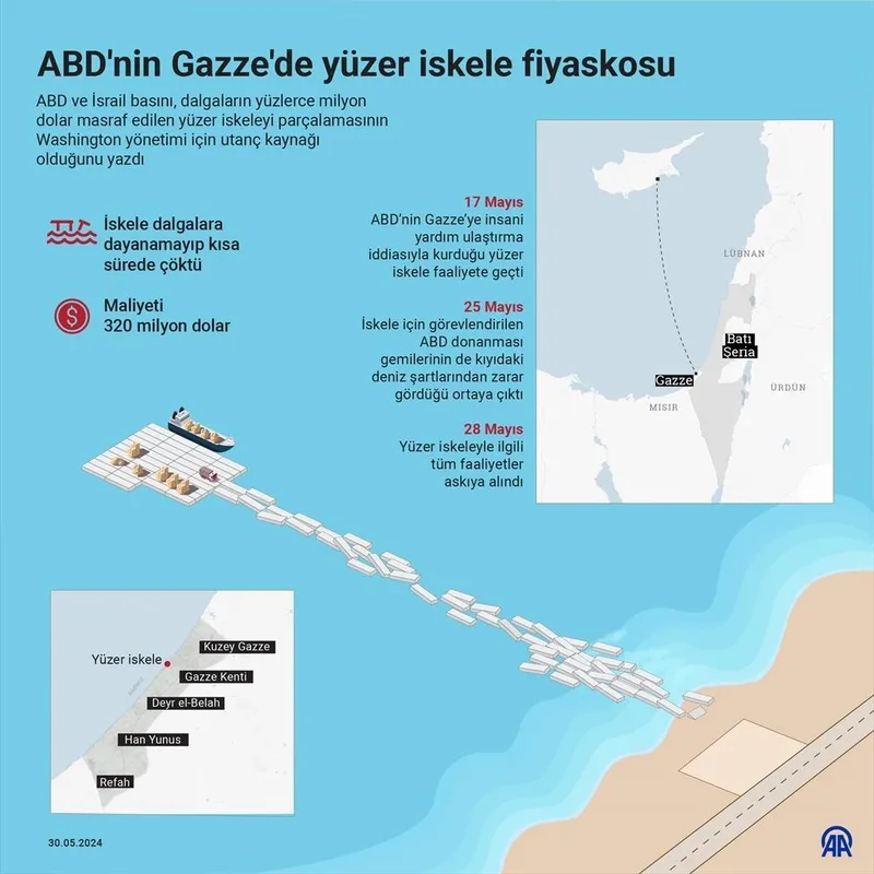 ABD'nin yaklaşık 320 milyon dolara yaptırdığı ve 17 Mayıs'ta faaliyete giren geçici iskele 3 haftalık ömründe bir dizi "fiyasko" yaşarken, Gazze'nin acil ihtiyacı olan insani yardımlar son yaşananların ardından askıya alındı.