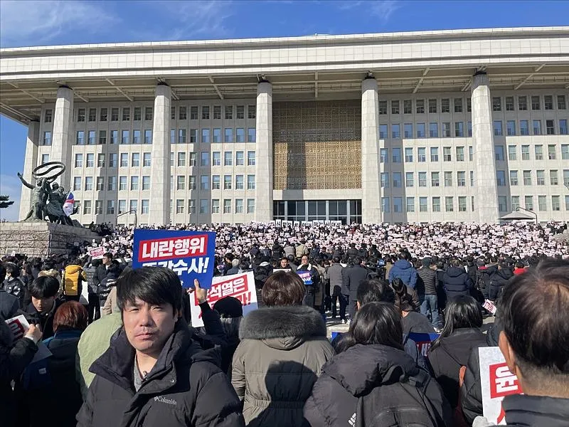 Yonhap'ın haberine göre, sıkıyönetim ilan edilmesinin ardından binlerce kişi, karara tepki göstermek üzere Ulusal Meclis'in etrafında toplandı. Protestocular, "Sıkıyönetimi sonlandırın" ve "Yoon Suk Yeol tutuklansın" sloganları attı.