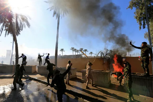 ABD yönetiminin Haşdi Şabi'ye bağlı Hizbullah Tugaylarına düzenlediği saldırıyı protesto etmek için sabah saatlerinde Bağdat'taki ABD Büyükelçiliği önünde toplanan yüzlerce kişi, önce elçilik binasının duvarını ateşe vermiş ardından içeri girmişti. Elçilikteki güvenlik güçlerinin göstericilere müdahale etmesi sonucu 20 eylemci yaralanmıştı. Irak Başbakanı Adil Abdulmehdi de yaşanan gerginlik nedeniyle protestoculara elçilik binası önünden acilen ayrılmaları çağrısında bulunmuştu.