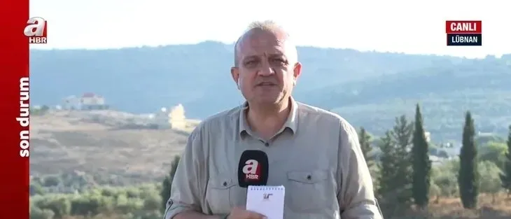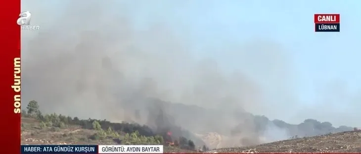 "İsrail savaş uçakları 1 noktaya atış gerçekleştirdi. Şimdi kameraman arkadaşım Aydın Baytar gösterecek. Bir duman bulutu vardı ama rüzgarın etkisiyle o duman dağıldı. Üst taraftan bizim de buradan kuş bakışı görebildiğimiz yaklaşık 1-2 km uzaklıktaki o tepenin üzerindeki bir nokta İsrail savaş uçakları tarafından hedef alınmış durumda.Tabii oradan dumanlar dağıldı ama bir diğer tarafta dumanlar yükselmeye devam ediyor. Hatta orada bir yangının çıktığını buradan gözlemleyebiliyoruz. Şuan itibarıyla yangın da çıkmış durumda. Bu tür karşılıklı saldırılardan dolayı orman yangınları da çıkabiliyor. Ne yazık ki yine ciğerle yanıyor. Sadece atış yapılmıyor. İşte o saldırıların ardından da füzelerin düştüğü yerlerden roketlerin düştüğü yerlerde de orman yangınları çıkabiliyor. İşte onlardan bir tanesine de A Haber canlı yayınında sizlerle paylaşıyoruz. Kameraman arkadaşım Aydın Baytar'ın özel görüntüleri ile birlikte bulunduğumuz nokta Lübnan'ın Güney kesimleri. Ve dakikalar önce bulunduğumuz o noktaya İsrail savaş uçakları tarafından bir atış gerçekleştirildi. Önce yoğun bir duman kütlesi belirdi. Gördüğümüz kadarıyla işte patlamanın ardından alevler yükselmeye devam ediyor. Burası Lübnan İsrail sınırı. Yaklaşık 90 km'lik bir alandan bahsediyoruz. Sınır hattından bahsediyoruz. İşte son patlamanın yaşandığı nokta. Uçak hareketliği devam ediyor. Her diyoruz. 30 saniye sonra ne olacağını bilmediğimiz bir coğrafyadan bahsediyoruz. Atışın yapıldığı ve dumanların yükseldiği nokta 8-9 km'lik bir nokta. Lübnan'ın Güney'i sınır noktasındayız. Çok yoğun bir duman hareketliliğini gözlemliyoruz. İsrail sürekli olarak bu noktaları vuruyor. Çünkü bu noktalar Hizbullah'ın kontrolündeki noktalar."