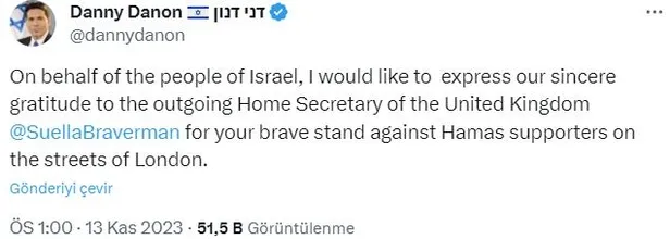İsrail Başbakanı Benjamin Netanyahu liderliğindeki Likud Partisi Milletvekili Danny Danon, İçişleri Bakanı Suella Braverman'ı görevden alınmasından rahatsız oldu. Danny Danon; "İsrail halkı adına, görevden ayrılan Birleşik Krallık İçişleri Bakanı'na Suella Braverman Londra sokaklarında Hamas destekçilerine karşı gösterdiği cesur duruştan dolayı içten şükranlarımızı sunmak isterim" dedi.