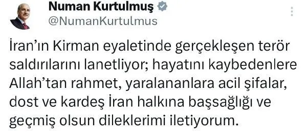 TBMM Başkanı Numan Kurtulmuş, sosyal medya hesabından yaptığı açıklamada, "İran'ın Kirman eyaletinde gerçekleşen terör saldırılarını lanetliyor, hayatını kaybedenlere Allah'tan rahmet, yaralananlara acil şifalar, dost ve kardeş İran halkına başsağlığı ve geçmiş olsun dileklerimi iletiyorum" dedi.