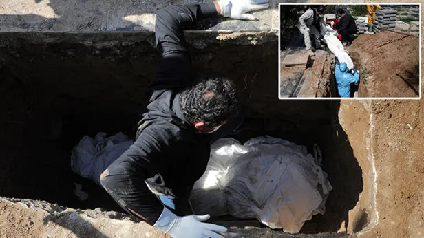 Kimisi beyaz kefenlere sarılmıştı. Bunların sabah "hazırlandığını" söyledi. Sonra özensizce yere konmuş, toprağa verilmeden önce yıkanıp kefenlenmeyi bekleyen sıra sıra siyah ceset torbalarını gösterdi.