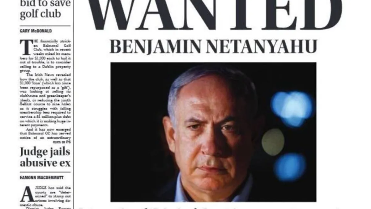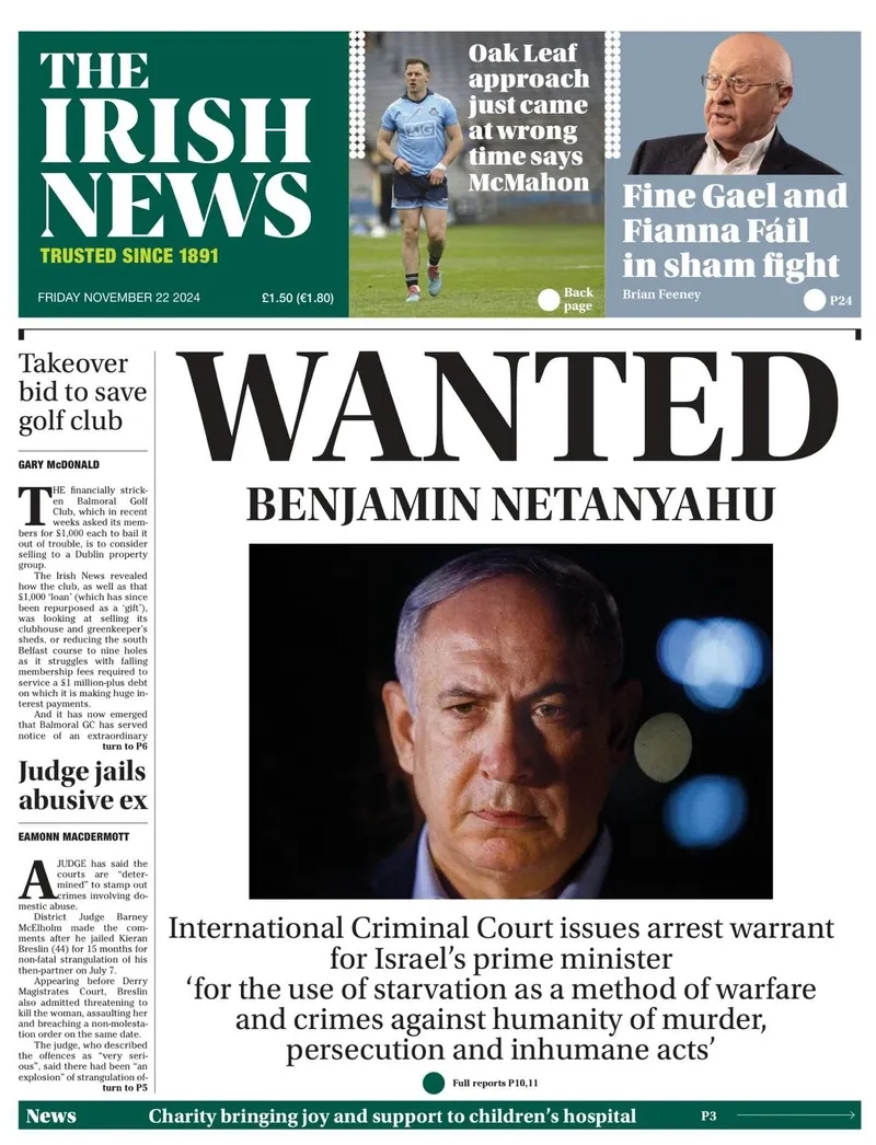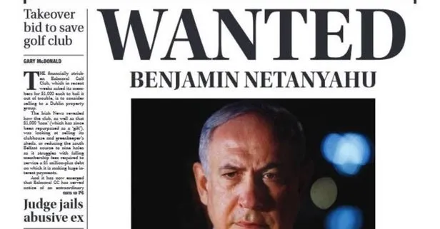 İrlanda'nın köklü gazetesi The Irish News, 22 Kasım 2024 tarihli sayısında, İsrail Başbakanı Benjamin Netanyahu'yu hedef alan çarpıcı bir manşetle gündeme geldi. Gazetede, Netanyahu'nun fotoğrafı eşliğinde büyük harflerle "WANTED" (Aranıyor) ifadesi yer alırken, Uluslararası Ceza Mahkemesi'nin Netanyahu hakkında "savaş suçu, insanlığa karşı suçlar ve açlığı savaş aracı olarak kullanma" suçlamalarıyla tutuklama kararı verdiği vurgulandı.