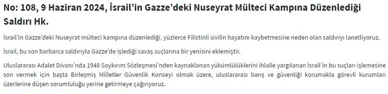 İsrail'in Gazze'deki Nuseyrat mülteci kampına düzenlediği, yüzlerce Filistinli sivilin hayatını kaybetmesine neden olan saldırıyı lanetliyoruz.