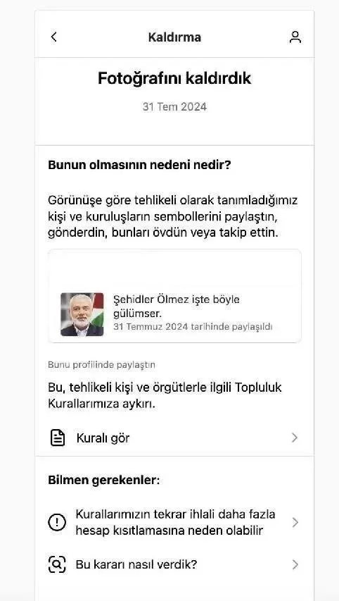 Instagram'ın İsrail'de yaşanan katliama açıkça destek çıkması ve şehit Hamas lideri İsmail Haniye paylaşımlarına uyguladığı sansür politikası büyük tepki çekmişti. Tüm bu yaşananlara Türkiye'den birçok isim tepki göstermişti. Tepkilerin ardından sosyal medya platformu Instagram'a erişim engeli kararı alındı.